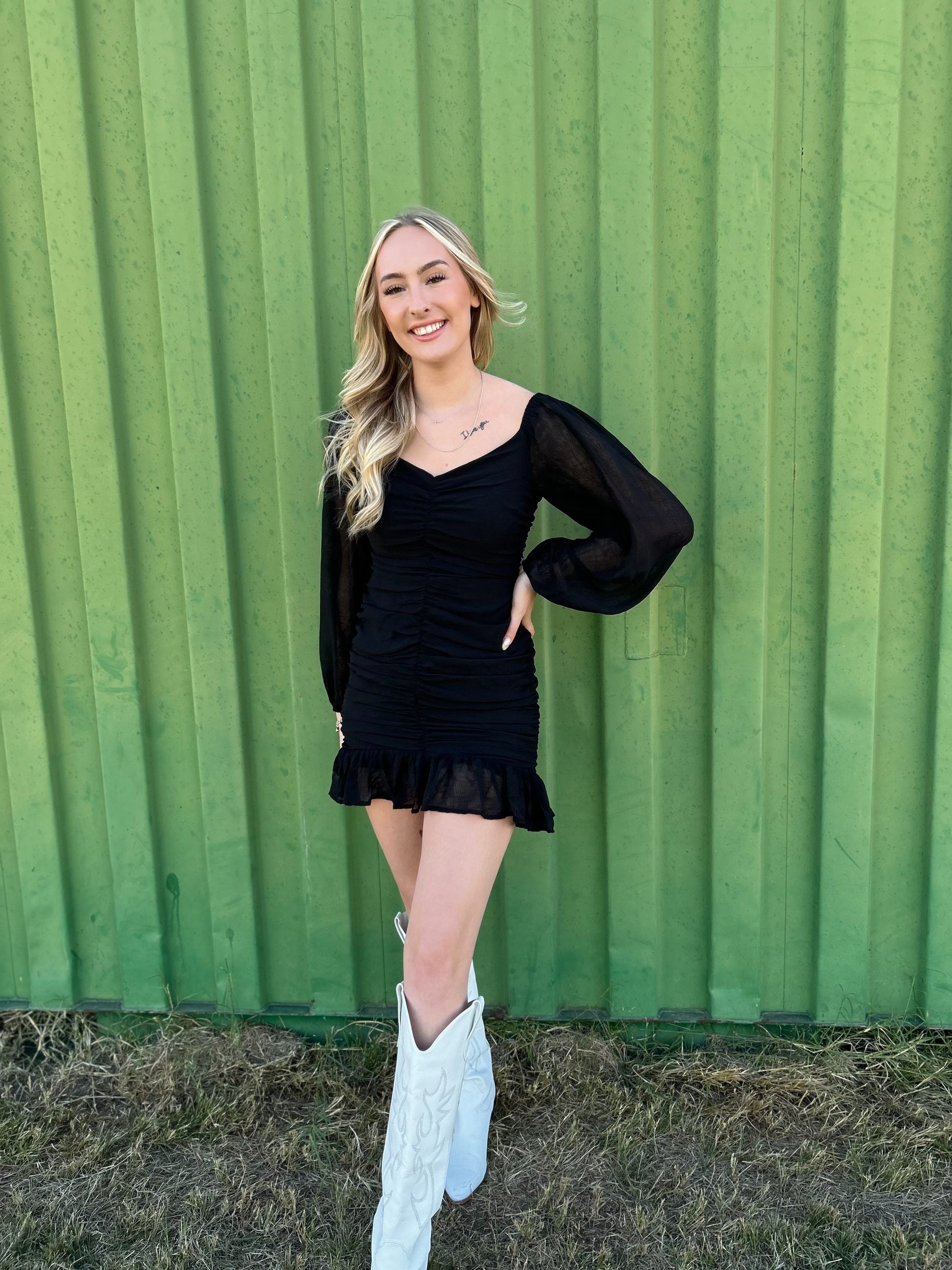 This black dress features long sheer sleeves that offer an elegant look while staying comfortable. The slim fit flatters your figure while staying classy.
