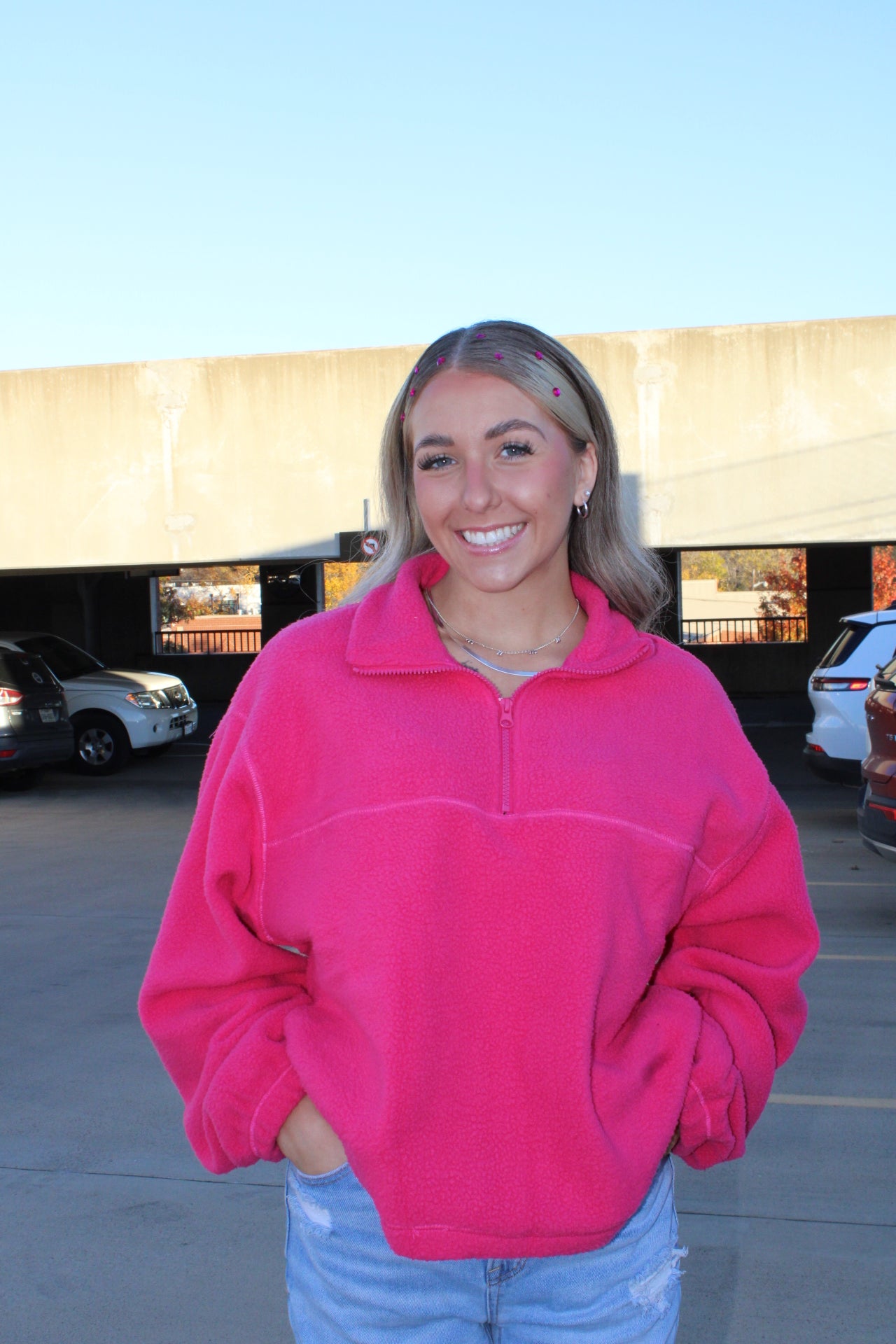 This Sherpa quarter-zip is the perfect winter wardrobe staple! Keep warm and stylish in a rich hot pink color, with a fleecy sherpa exterior for extra coziness. Its cute fit adds a touch of charm to any outfit.